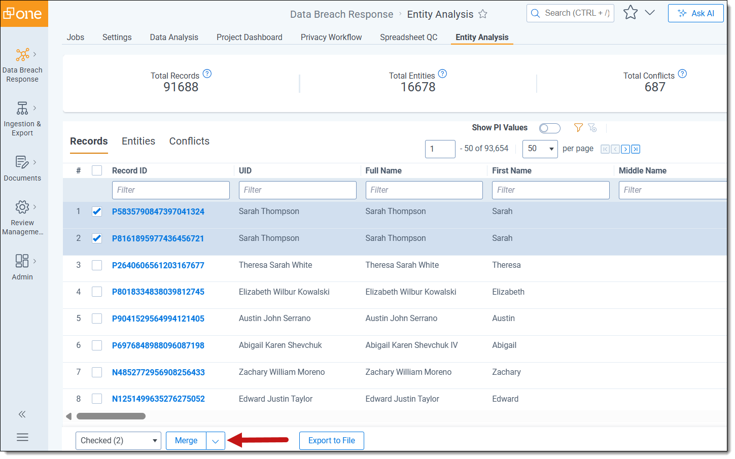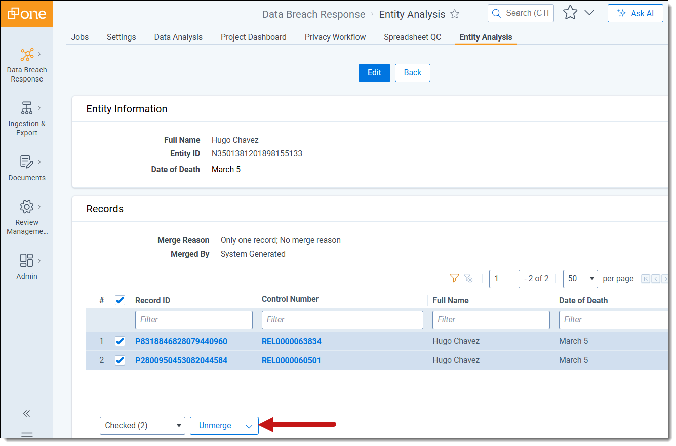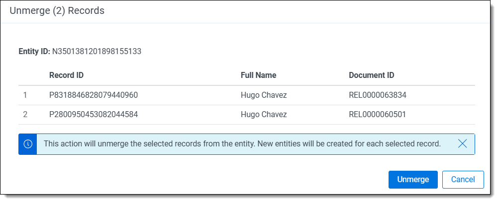 - Review the records set to be unmerged and click Unmerge to confirm.