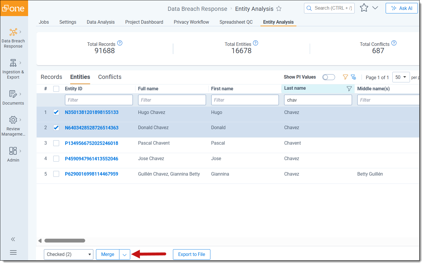 Select the checkbox next to each entity in the Entity List that you want to merge.