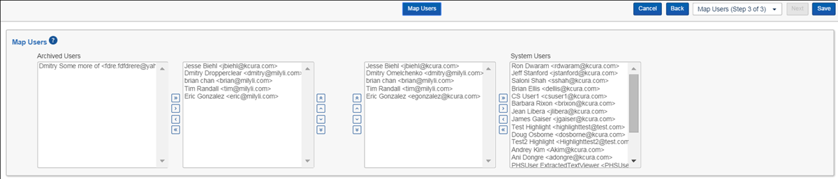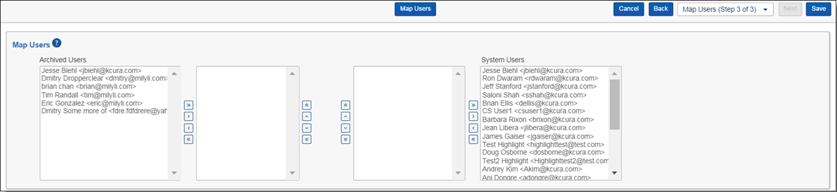 Click Map Users to perform the automatic mapping. The following image shows the users from the Archived Users section mapped to matching users from the System Users section.