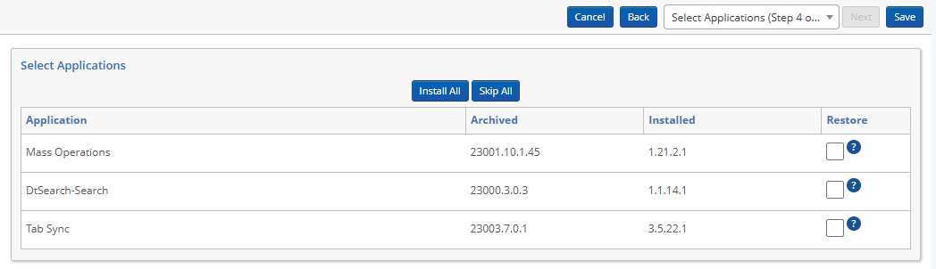 The Select Applications screen lets you see the applications that will be restored to the new workspace and upgraded to match the version found in the application library.