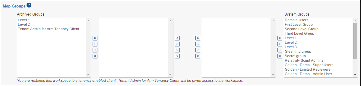 When you attempt to restore a workspace to a client domains (tenancy)-enabled client, which is determined by the selected matter, a message appears on the Map Groups page indicating that the client domain (tenant) admin account for the associated client will be given access to the workspace.