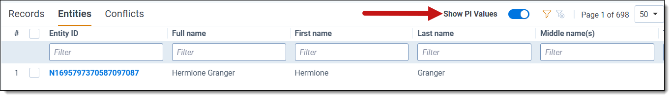 - Toggle on Show PI Values to view PI in the Entities tab.