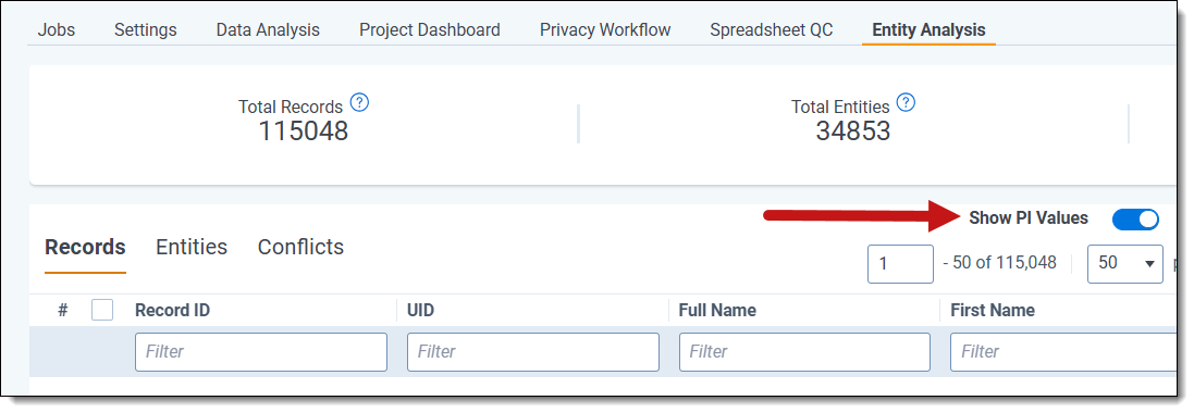 The Show PI Values toggle is turned off by default. When this toggle is turned off, each column shows the count of PI values found of that type for that entity. Turn the Show PI Values toggle on to view PI values instead of counts. - Review and validate that PI or sensitive data was correctly identified.