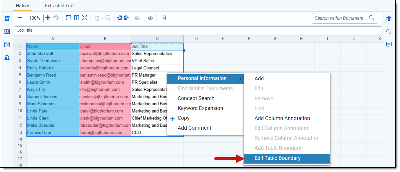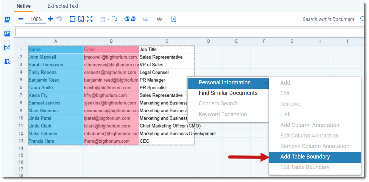The Data Breach Response product identifies table boundaries with column headers to predict where and what type of personal information is contained in tables. There are instances where tables boundaries may need to be edited, removed, or added.