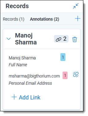If the Link action is not available, try clearing your browser's cache and refreshing the page. - The newly linked information appears in the Records panel.