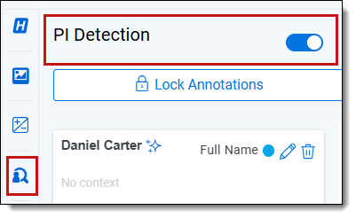 To save PI detections before Data Analysis is run, click the Lock Annotations button in the PI Detections panel. You can continue to make changes and Add/Edit/Remove PI after a document is locked. Those updates will remain on the document.