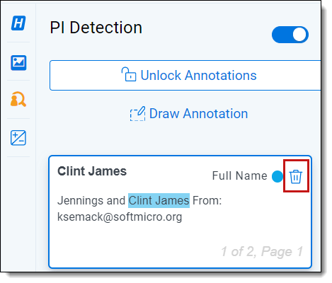 To view identified PI in a structured document, open the PI Detection pane and toggle on PI Detection.