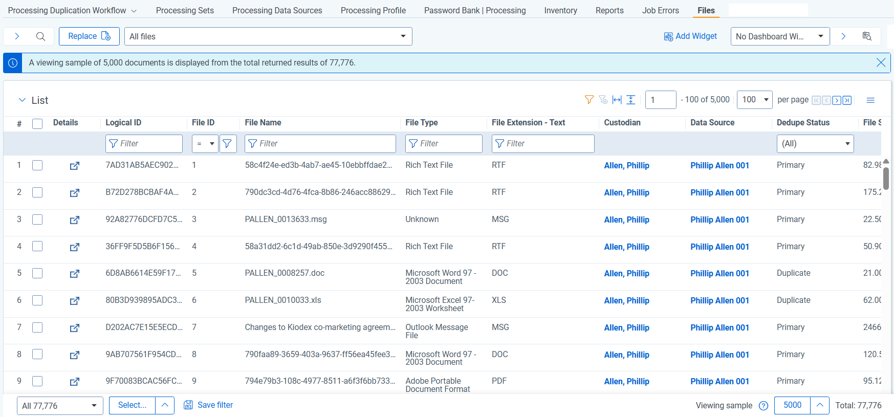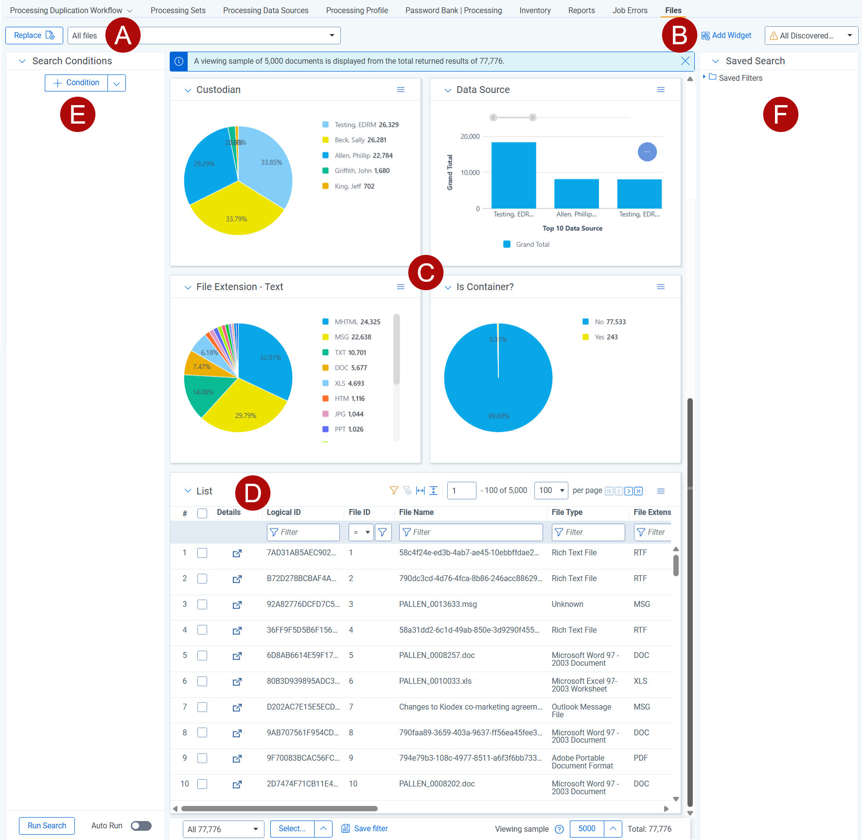 The All Files view contains all the discovered files in your workspace. This view does not contain documents that have been deleted and have a Yes value for the Processing Deletion? field. Those documents can only be found in the Deleted Documents view described in the next section.