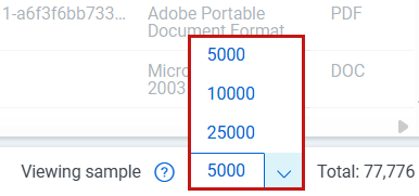 • The number of browsable documents (viewing sample) is limited to the Viewing sample setting. This number represents a sample of the data set. A banner just above the list lets you know the sample size and the total number of documents in the data set.