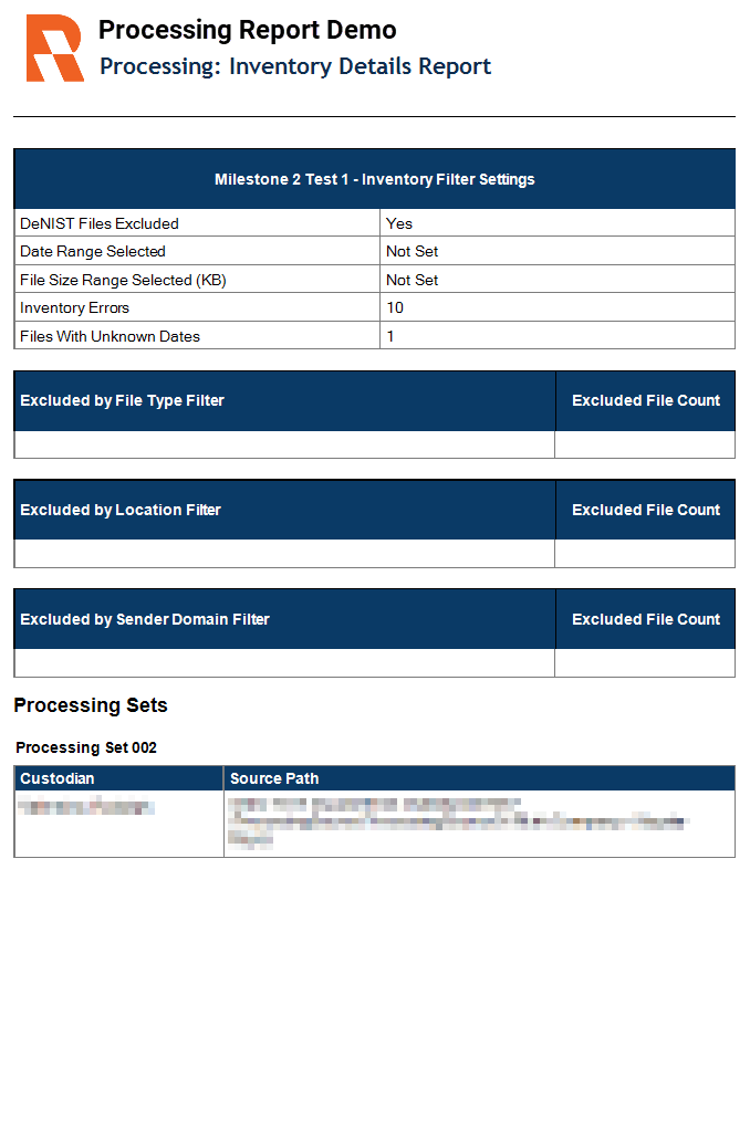 Provides detailed information on date range excluded, file size limitations, and deNIST inventory settings. This report also provides counts of files excluded by applied filters and categorizes the results by file type, sender domain, file location, and custodian. All excluded file counts are absolute. You can run this report on inventoried processing sets.