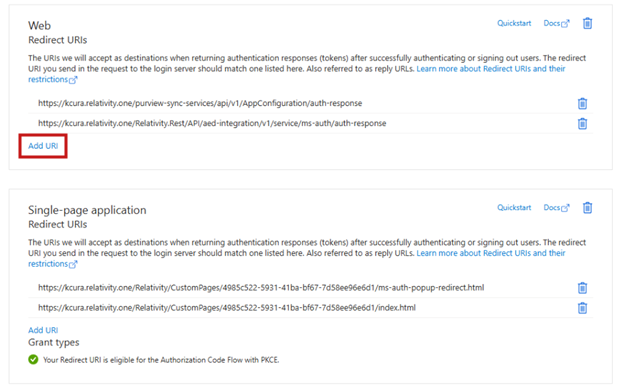 - Add additional redirect URI under Web. Click the Add URI button again and enter https://[RelativityOne URL without including the word relativity forward slash] + purview-sync-services/api/v1/AppConfiguration/auth-response. For example, https://company.relativity.one/purview-sync-services/api/v1/AppConfiguration/auth-response.