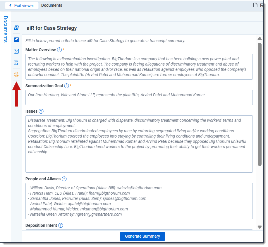 You can create a summary of a transcript using Generative AI to quickly find relevant information for your case. Once a Transcripts Summary has been created, it can be viewed on the Native Viewer or if you have aiR for Case Strategy installed, you can also view a more detailed summary on the Case Home tab.