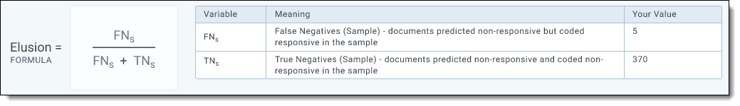 - Elusion Rate—the percentage of unreviewed documents that are predicted as non-relevant, but that are actually relevant. The range listed below it applies the margin of error to the sample elusion rate, which is an estimate of the discard pile elusion rate.
