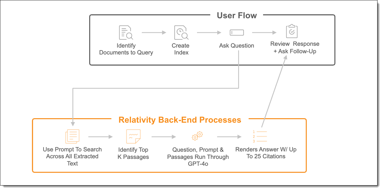 Each question is matched against the text indexed from the identified documents. aiR Assist performs a similarity search to identify the most relevant content. The documents are divided into smaller passages, and the system selects the top results that best correspond to the question. - Generating the answer (generation step)