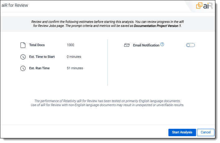 - Est. Run Time—estimated time it will take to analyze and return the results of the documents selected. This does not include time waiting in the job queue.