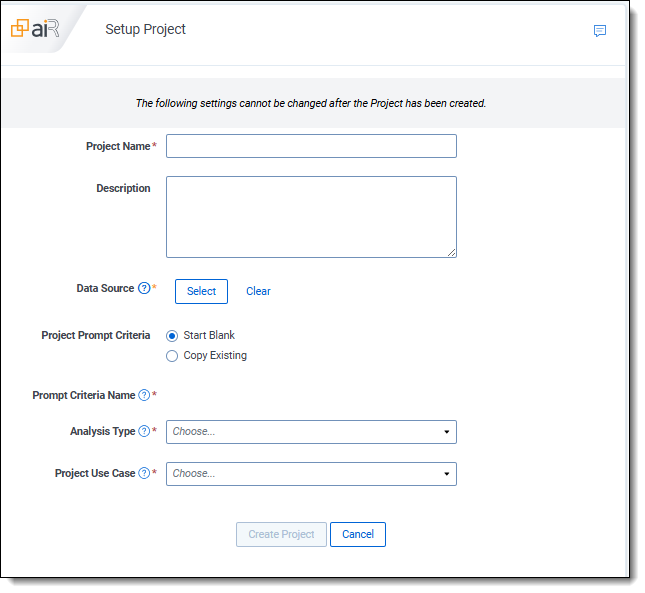 Begin by configuring the aiR for Review project, selecting the appropriate type of analysis, and specifying the desired data source (saved search). The aiR for Review project serves as a repository for all iterative project sets—develop, validate, and apply—that are created during the refinement of prompt criteria.