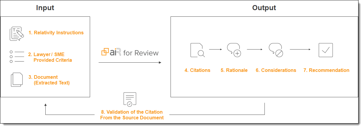 The aiR for Review process uses Relativity instructions, SME-developed prompt criteria, and extracted document text as input. It processes this data to produce document citations with rationale, considerations on possible prediction errors, and its recommendation, such as relevant, not relevant, or borderline. aiR then verifies up to five citations per document to ensure they are accurate and not the result of hallucinations.