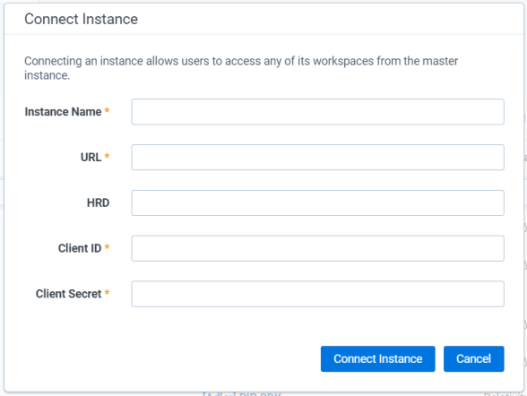 Click the ( Edit instance icon) icon to edit an existing registered instance connection or the ( ) icon to delete a registered instance connection. When editing the current instance, you can select a custom name to display for workspaces associated with that instance instead of the instance name.
