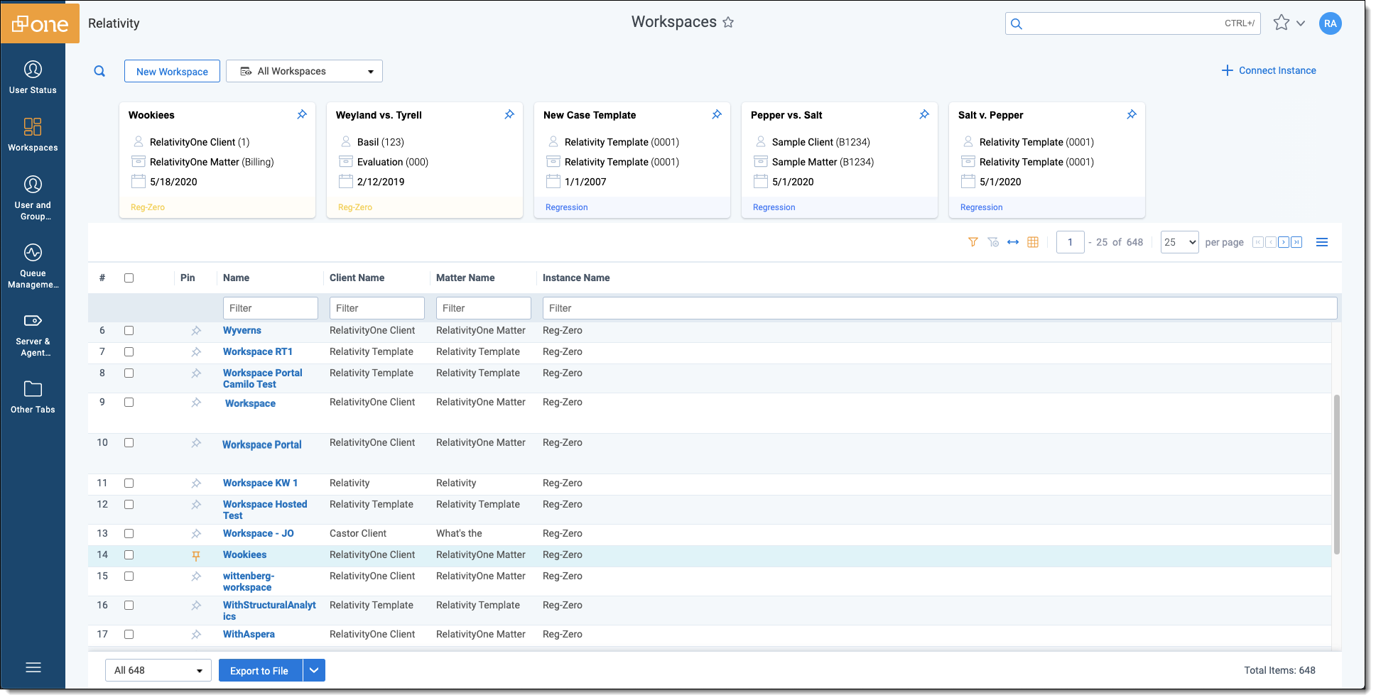 The Workspaces tab enables you to view a list of all the workspaces for both your master and satellite Relativity Server and RelativityOne instances from a single tab. The available list of workspaces displays in the grid, and you can pin your favorite workspaces and access them in the carousel at the top of the page.