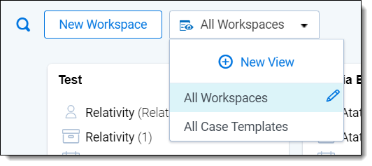 Clicking into the Views menu to the right of the New Workspace button lets you access the Relativity workspace views that you have access to within your local instance. You can also create a new viewusing standard Relativity Views functionality.