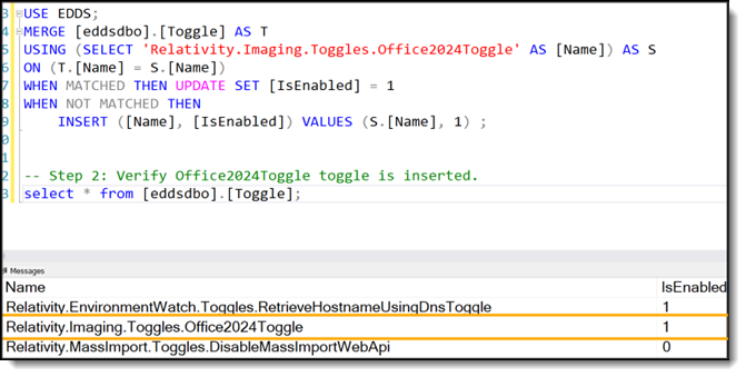 Run the following script to add or enable the toggle in the EDDS database for imaging: