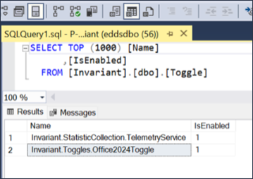 To verify that the Office 2024 toggle is enabled in Invariant, run the following script. The query should return a row matching the toggle as shown below.