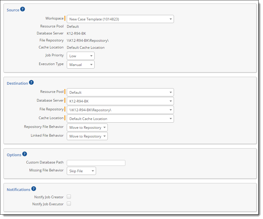 - The Resource Pool, Database Server, File Repository, and Cache Location drop-downs for Move jobs now respect the Visible in Drop-down property for Resource Pool and Resource Server artifacts. If the particular item you are looking for is not listed in the drop-down, check its corresponding artifact record and ensure this flag is turned on. All previously saved jobs that use items with this flag turned off will cause errors in future jobs.