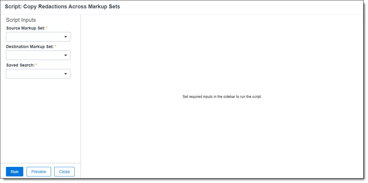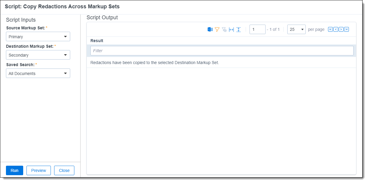 - Click Run in the row of the Copy Redactions Across Markup Sets script.