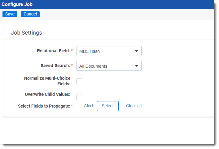 Saved Search - select the saved search that contains the documents you want to propagate values to. Ensure that the saved search returns all related documents; including the documents that values will be propagated to as well as documents that values will be propagated from. Values are propagated only to documents that are returned by the specified saved search.