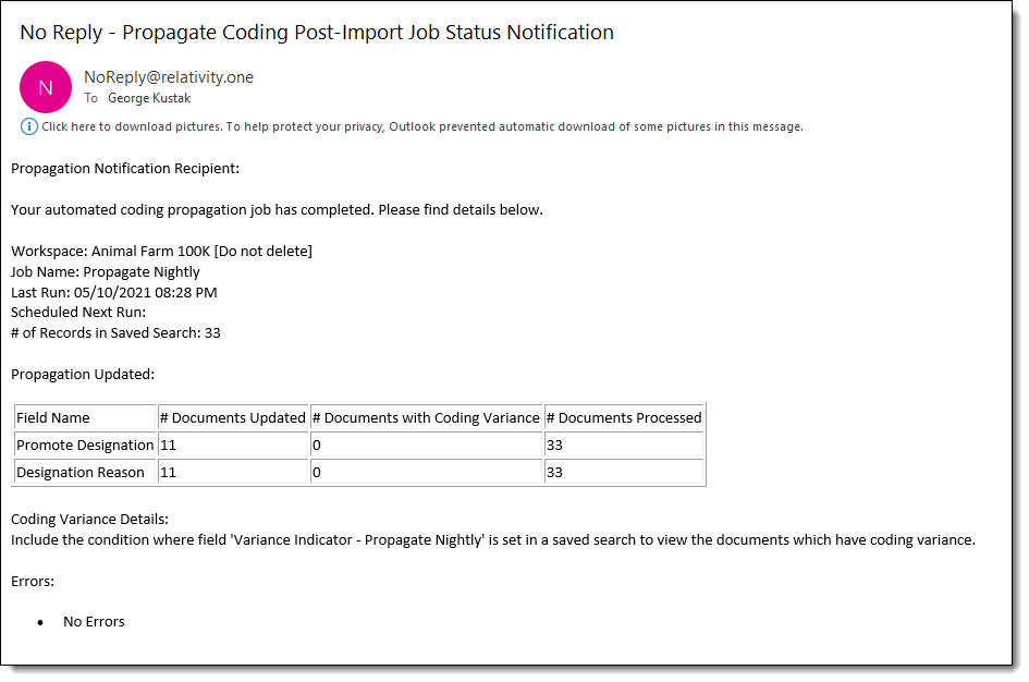 In addition to viewing the results directly in Relativity or by running the results script, you might also receive an email notification each time a propagation job finishes running. When you created the propagation job, you had the option of entering the email address of each person whom you want to receive an email notification when the job finishes running. The notification message provides details about the job, including any errors that occurred. The following is an example of a notification message.