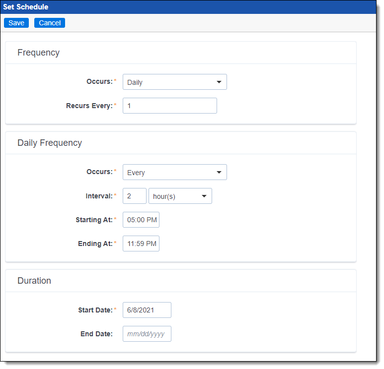 - in the Duration section, complete the following fields to specify a date range for running the job: