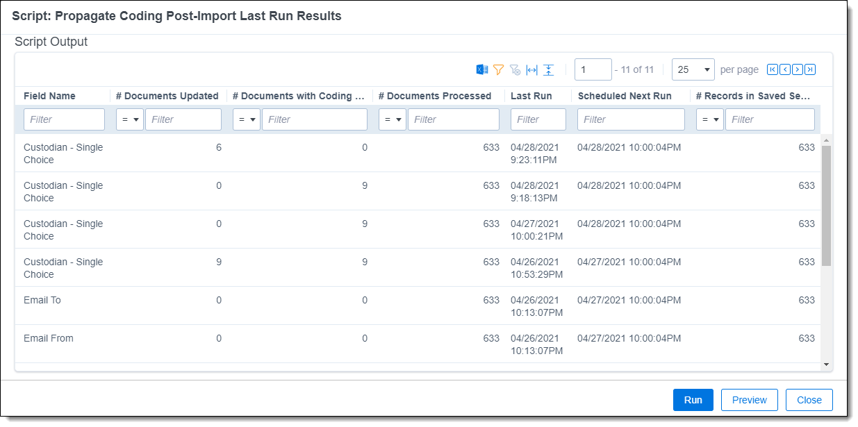 To view a detailed report of the results, you can run the "Propagate Coding Post-Import Last Run Results" script that's included in this solution. The script generates a report indicating the number of documents that were updated for each field and other information about those updates.