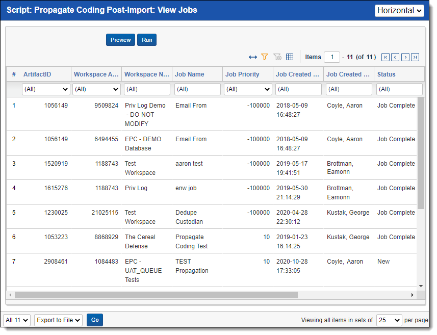 When jobs are sent to the processing queue, they are ordered first by priority and then by creation date and time across the Relativity instance. This solution includes a script that you can run to view a report of all the propagation jobs for the Relativity instance as well as details about each one, including status, priority, and workspace.