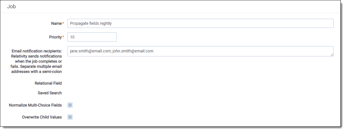 This application's performance depends primarily on the number of documents in the workspace and the number of documents that are updated. To optimize performance, we recommend that you run propagation jobs based on saved searches that return no more than 100,000 documents and return unique sets of documents. For example, avoid referencing the same saved search in more than one propagation job. In addition, the application's performance depends on the type of field that you're propagating data to and, for Single Choice or Multiple Choice fields, the number of choices for the field.
