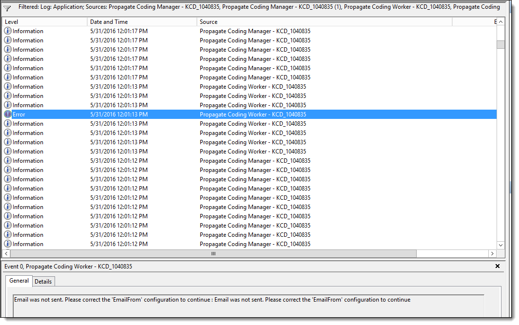 If the value is not set or the configuration is missing, the agent sends a notification via the Message column that there is a missing configuration. If no messages appear in the message column, navigate to the event viewer of your agent server and look for errors. The following screen shot shows the error that appears in the event viewer if the Email From field is misconfigured.