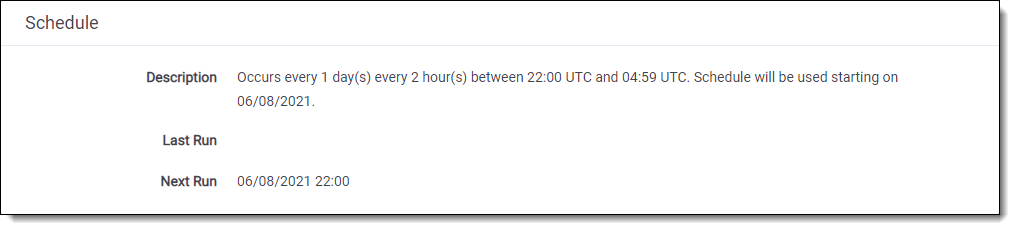 In the Schedule section of the job page, the Description field displays a summary of the schedule that you defined and the Next Run field indicates the next time when the job is scheduled to run.