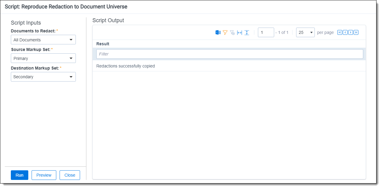 When the script is executed, it will copy all redactions on the selected source markup set to the destination markup set on all pages of all documents in the selected saved search. After the script runs, the report displays a message indicating that redactions were successfully copied.