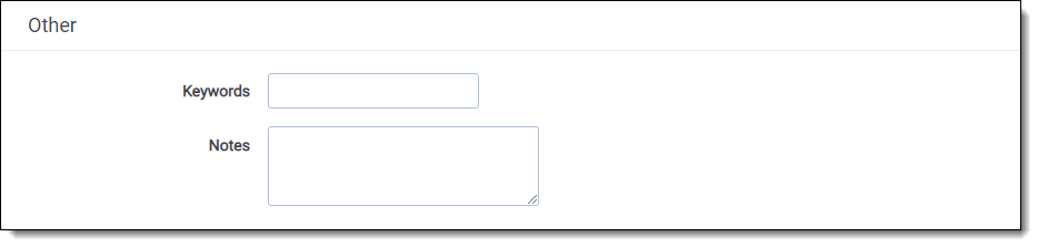 Two optional fields are available on several objects throughout Relativity. Use these to enter keywords and notes as a way of providing additional information about the object you're creating or editing.
