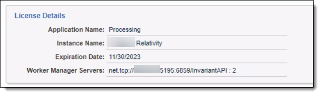 • Processing license—the details page displays the application name, Relativity instance name, expiration date, as well as the URL for each worker manager server, and the number of workers that it can run. In the following example, a worker manager server URL is net.tcp://mainline-7-inv.testing.corp:6859/Invariant API : #, and the number of workers that it can run is five.