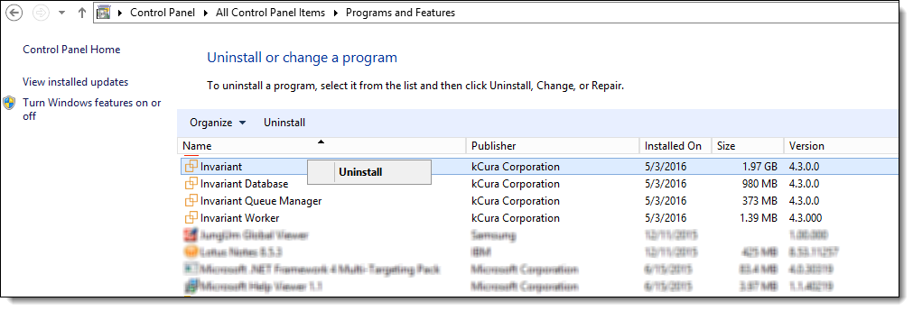 2. Uninstall Invariant on the server in the Windows Control Panel Add/Remove Programs. Doing this uninstalls existing Invariant applications.