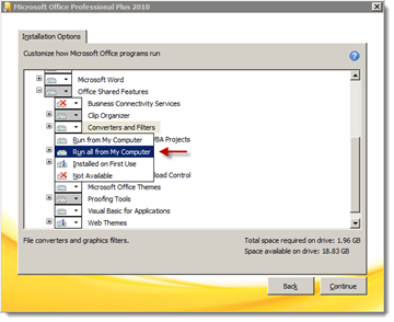 Run the installer for Microsoft Office. On the Installation Options tab, point to Office Shared Features. Point to Converters and Filters, and select Run all from My Computer.