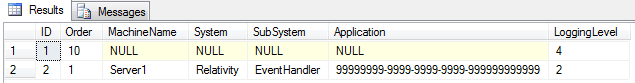 EXEC [EDDSLogging].[eddsdbo].[EnsureRule] @RuleID = NULL, @Order = 1, @MachineName = 'Server1', @System = 'Relativity', @SubSystem = 'EventHandler', @Application = '99999999-9999-9999-9999-999999999999', @LoggingLevel = 2, @SemiColonDelimetedListOfSinkNames = 'Default'