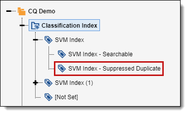 If you chose to suppress duplicate documents, you can view those documents from the Field Tree. You can find the tag for suppressed duplicate documents under the Classification index associated with the Active Learning project. Documents are tagged with the <Index Name> - Suppressed Duplicate tag as they're identified during review.