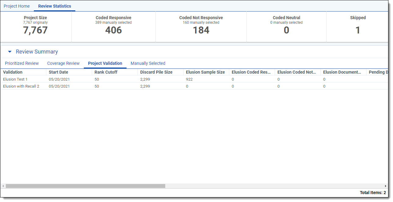 Use the Project Validation tab to monitor validation testing. A new row is created when Project Validation starts and is populated with the available information about the validation. As documents are coded, the counts and calculations update upon page refresh. If Project Validation is stopped before completion, statistics are calculated based on what has been coded so far.