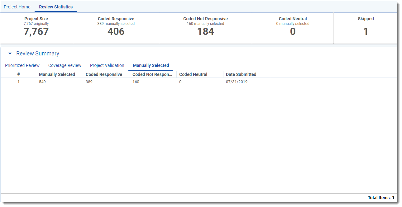 - Skipped - the number of documents that were saved or had Save and Next selected with no coding decision supplied on the review field (excludes additional reviewed by family).