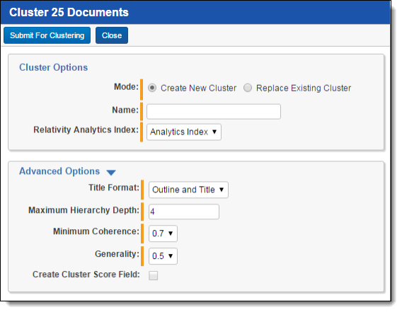 • Relativity Analytics Index - the Analytics index that is used to cluster your documents. The index you select here must have queries enabled for you to be able to submit the selected documents for clustering. All of the selected documents must be in the data source of this index; otherwise, they end up as Not Clustered.