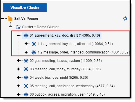 Also in the example above, cluster 1.1 contains the terms "agreement, kay, doc, attached," and the parentheses contain the numbers (10064, 0.51):
