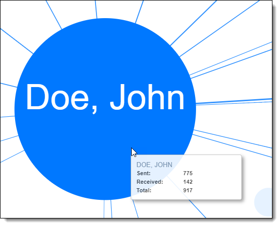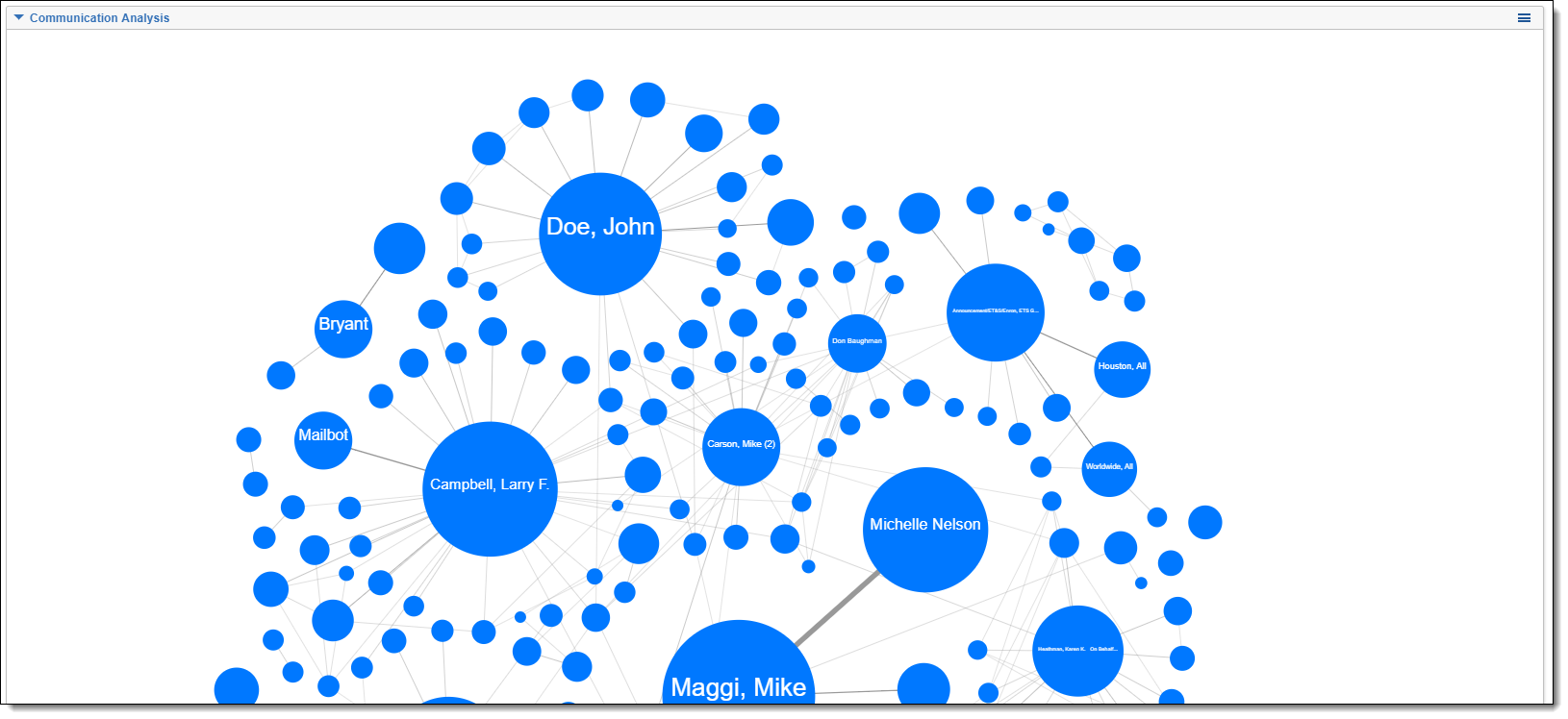 Each entity is represented by a blue circle called a node. Nodes are sized based on the number of times the entity appears in the Entity From and Entity Recipient document fields, which represents the total amount of communications the entity was involved in. By looking at the size of the nodes in comparison to one another, you can determine the entity that communicated on the most documents.