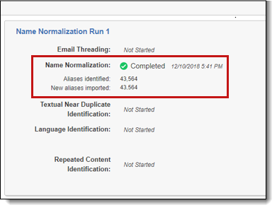 After you run the name normalization operation, the structured analytics set displays the number of aliases identified and the number of new aliases imported. If an alias already exists in Relativity, it isn't created again so as not to create duplicates.