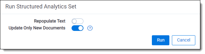 • If you rerun a structured analytics set with Update Only New Documents set to No, the old structured analytics data for the structured analytics set will automatically be purged. Any documents that were originally in the searchable set, but were removed after updating, will have their results purged. The purge will only affect documents associated with the operation that was run. Repeated Content Filters are never purged and name normalization results are never purged.